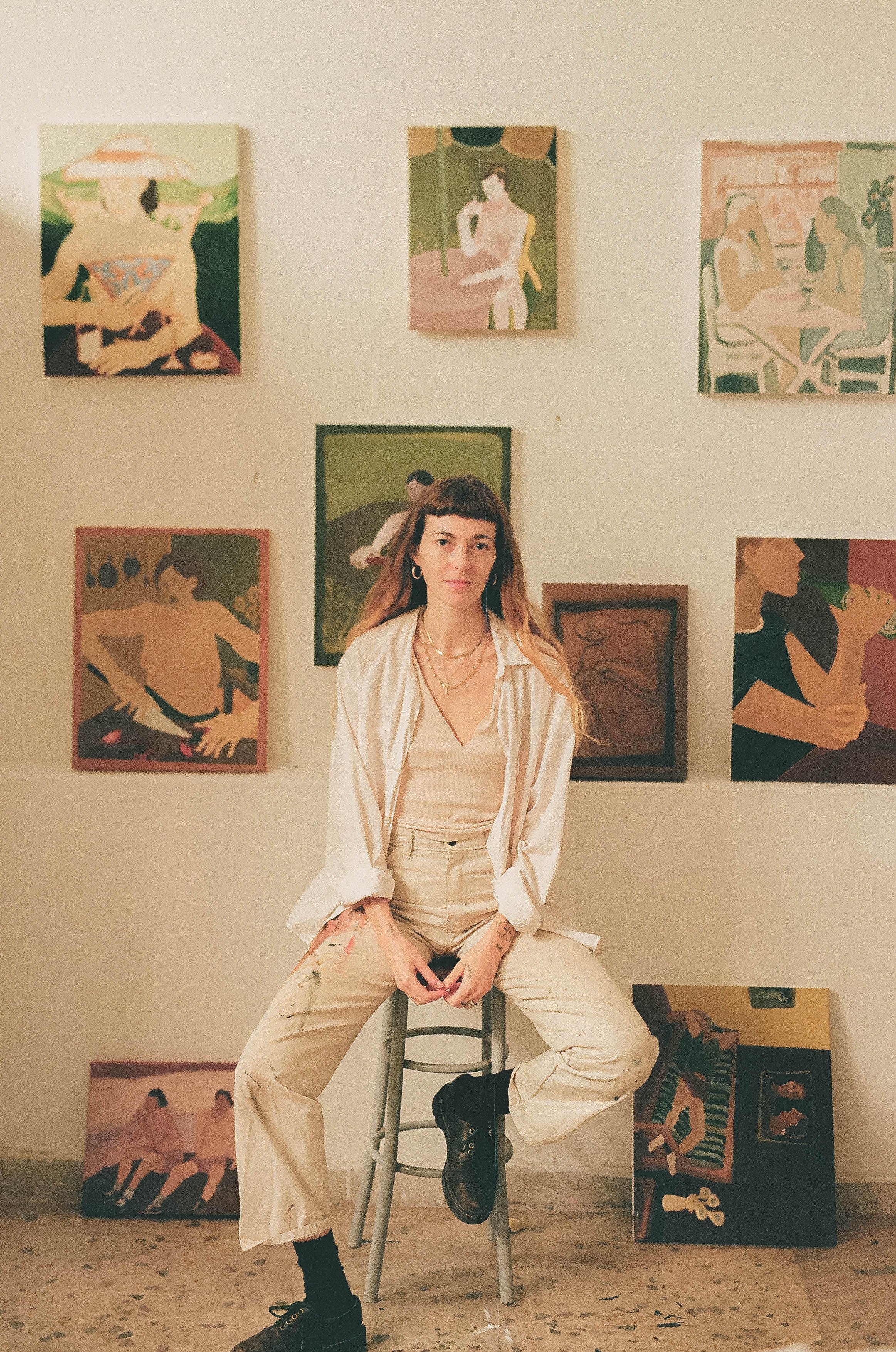 Anouk Aumont is an emerging multi-disciplinary artist. She primarily paints with oil stick, acrylic and pastel. Aumont hints obliquely at narrative often employing the use of pastel hued scenes and paper collage that reflect mundane yet intimate moments of everyday life. In a world of increasing noise, speed, and distraction, Anouk feels it is both radical and necessary to center slowness, simplicity, and reverence for the everyday.